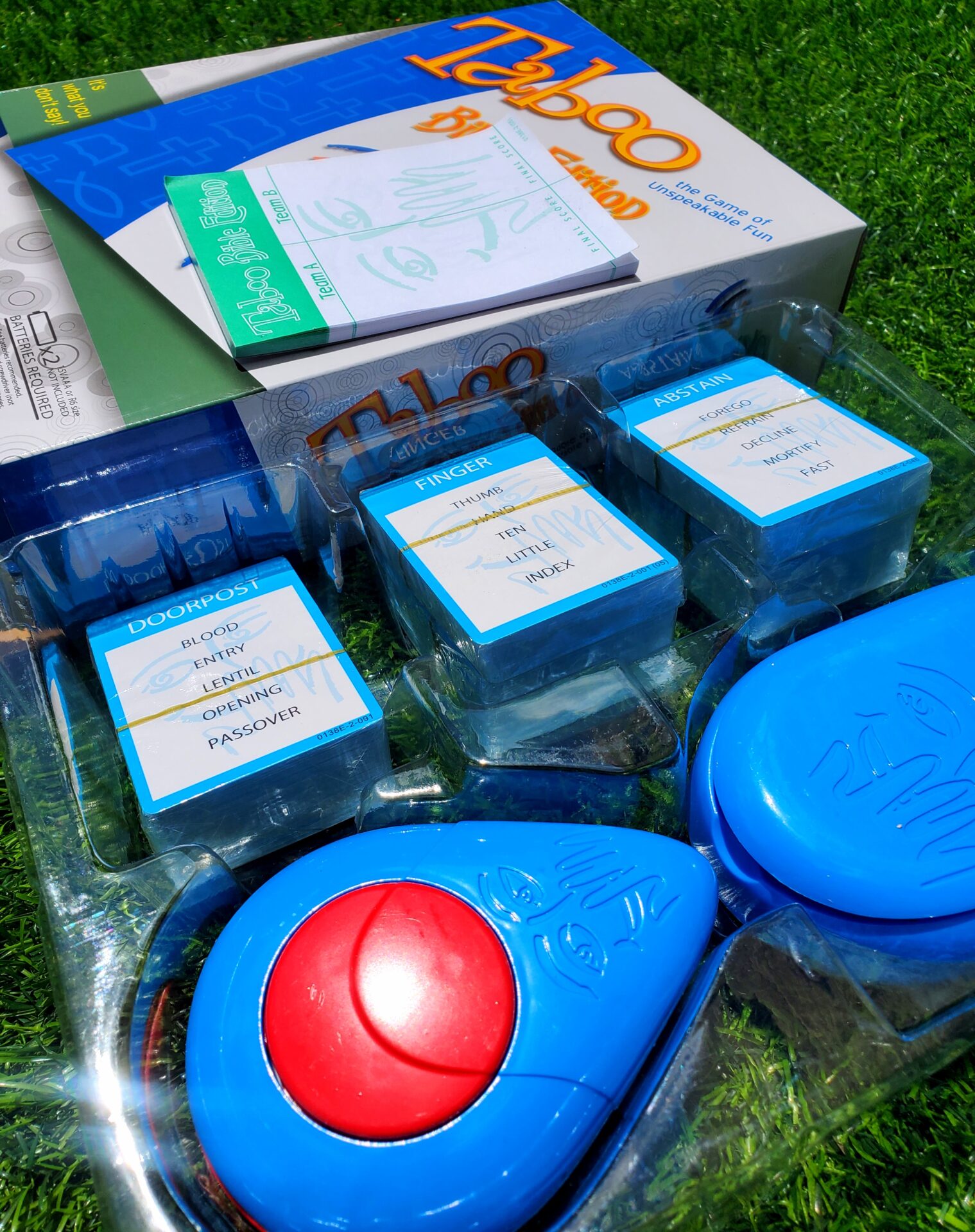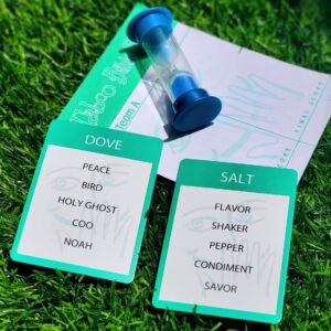 To get your team to say MOSES would you say PRINCE, EGYPT, PLAGUES, PHAROAH, or COMMANDMENT? In this game you can’t, because all of those words are strictly TABOO! Rattle off clues while the time counts down. You’ll earn a point each time your team guesses correctly. But watch what you say! If your opponent’s hear a TABOO word, you’ll get buzzed and they’ll get the point!